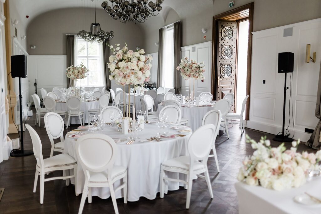 A kastély -szervezői szemszögből- nem egyszerű helyszín. Hatalmas terület, ahol könnyű „elveszni”, sok kisebb helység van az épületen belül. Egyszóval, nem egy klasszikus bálteremről beszélünk, ahol minden egy helyen van és mindent látsz a sarokból. Mivel az épület minden egyes szeglete mestermű, én javaslom, hogy ezt használjátok ezt ki és használjátok a helységeket. Kis odafigyeléssel a program felépülhet úgy, hogy a vendégek is kiélvezhessék a helyszín adottságait. Létszám függvényében tudtok válogatni, hogy hol szeretnétek a vacsorát és a partyt tartani.
